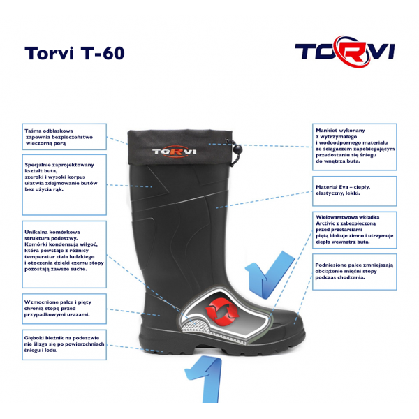Buty Torvi 60 to model o indeksie temperatury do -60’C, stworzone specjalnie do pracy i wypoczynku w ekstremalnie niskich temperaturach. Wykonane z materiału Eva, który dzięki wypełnieniu mikroskopijnymi pęcherzykami powietrza jest bardzo lekki i jednocześnie tworzy doskonałą izolację termiczną.